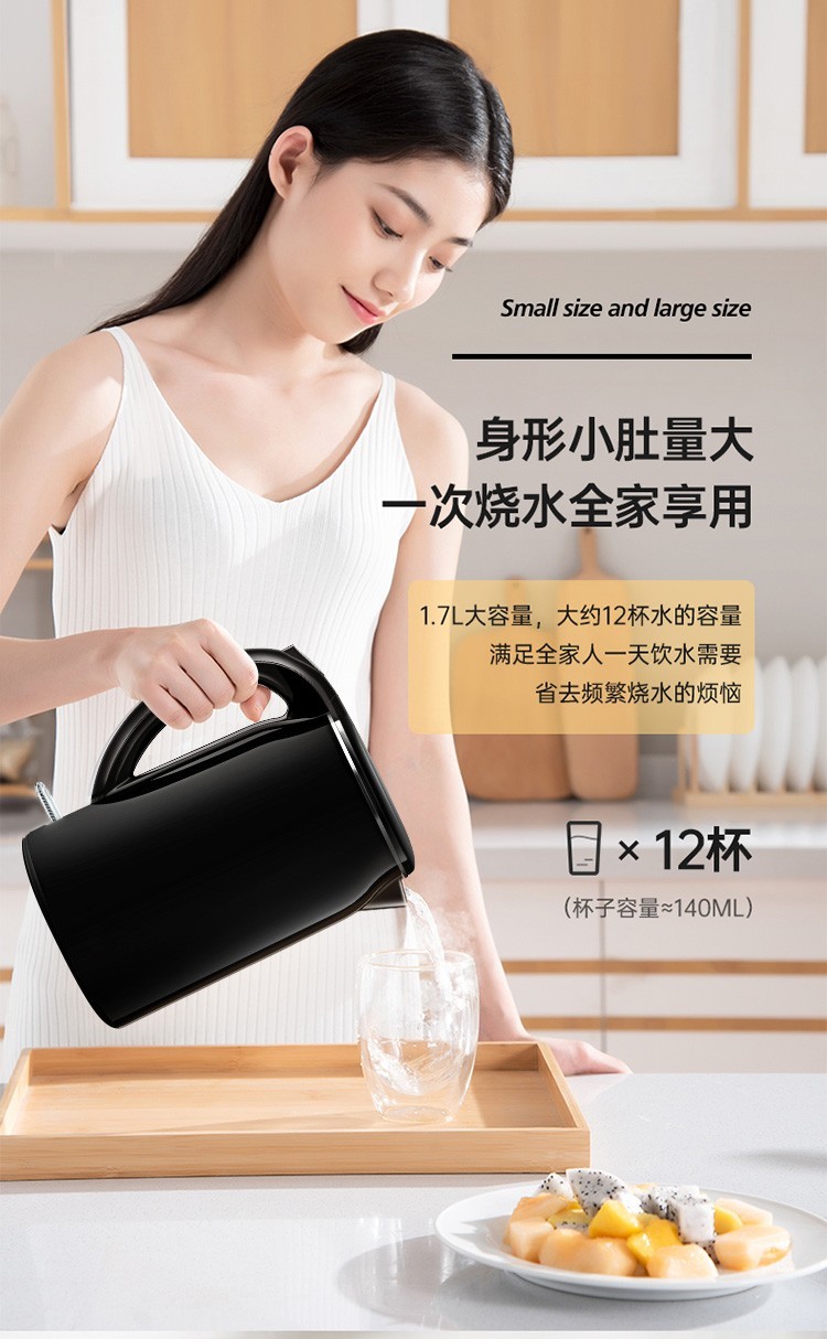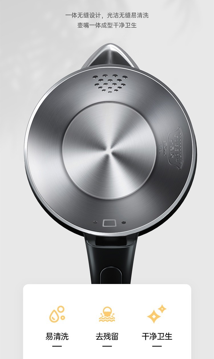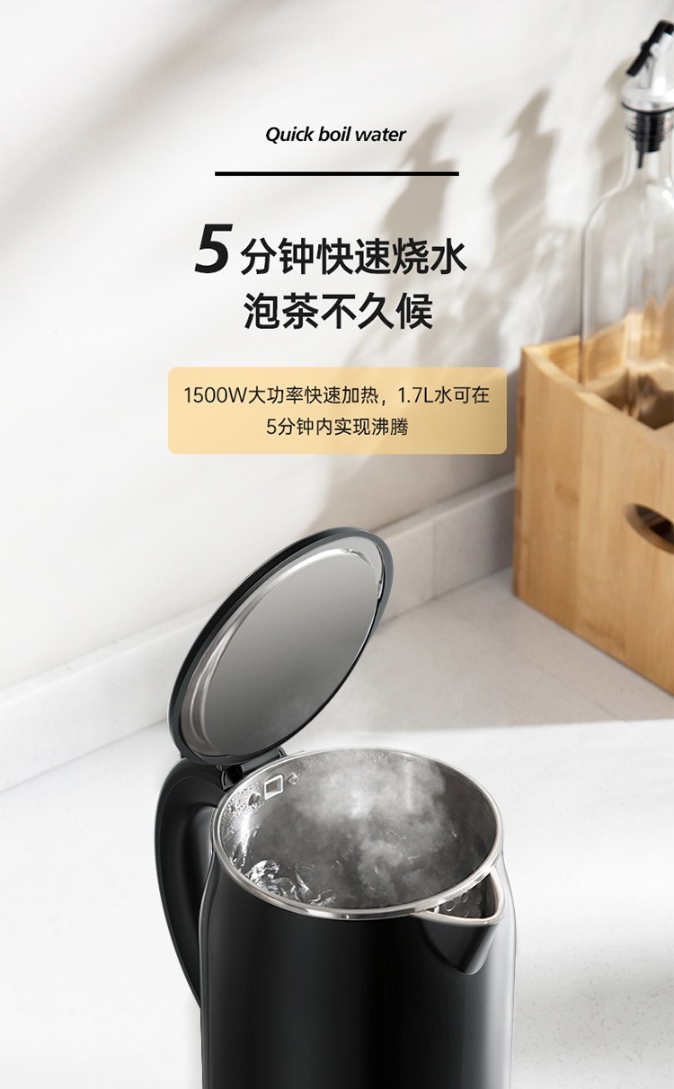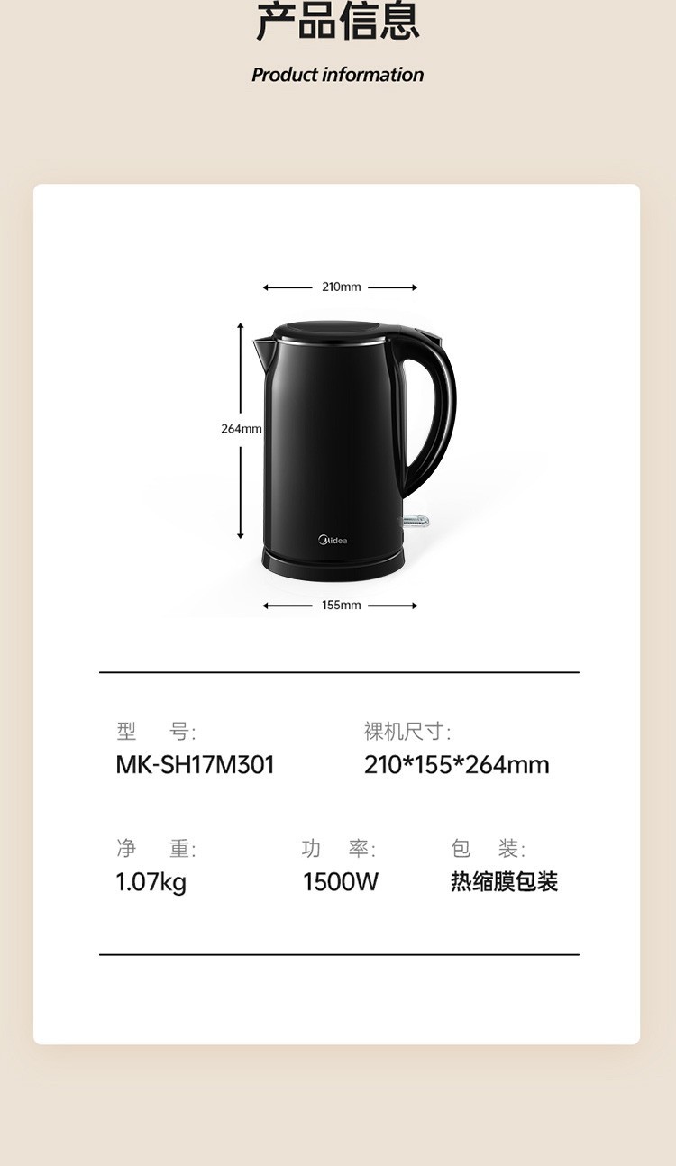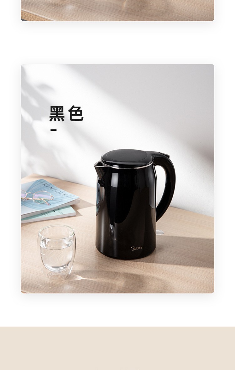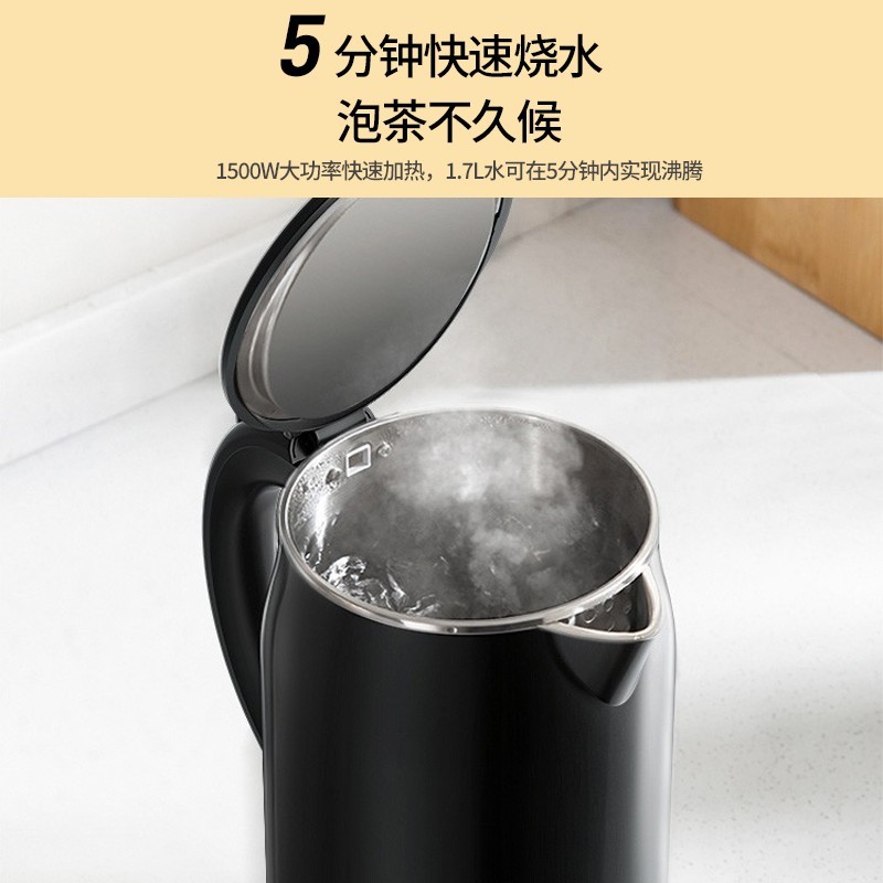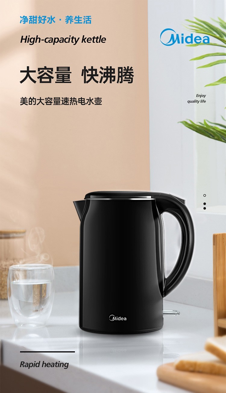美的(Midea)电热水壶 1.7L大容量 双层防烫 304不锈钢无缝内胆
