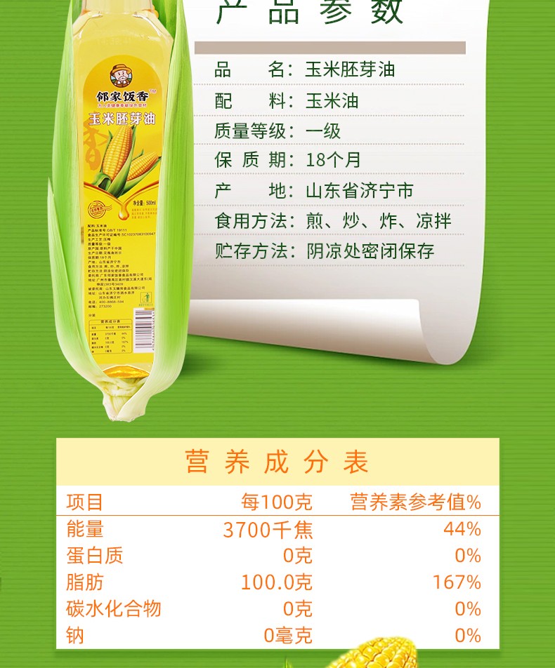 邻家饭香 压榨一级玉米胚芽油 非转基因LJFX34 500ml/瓶